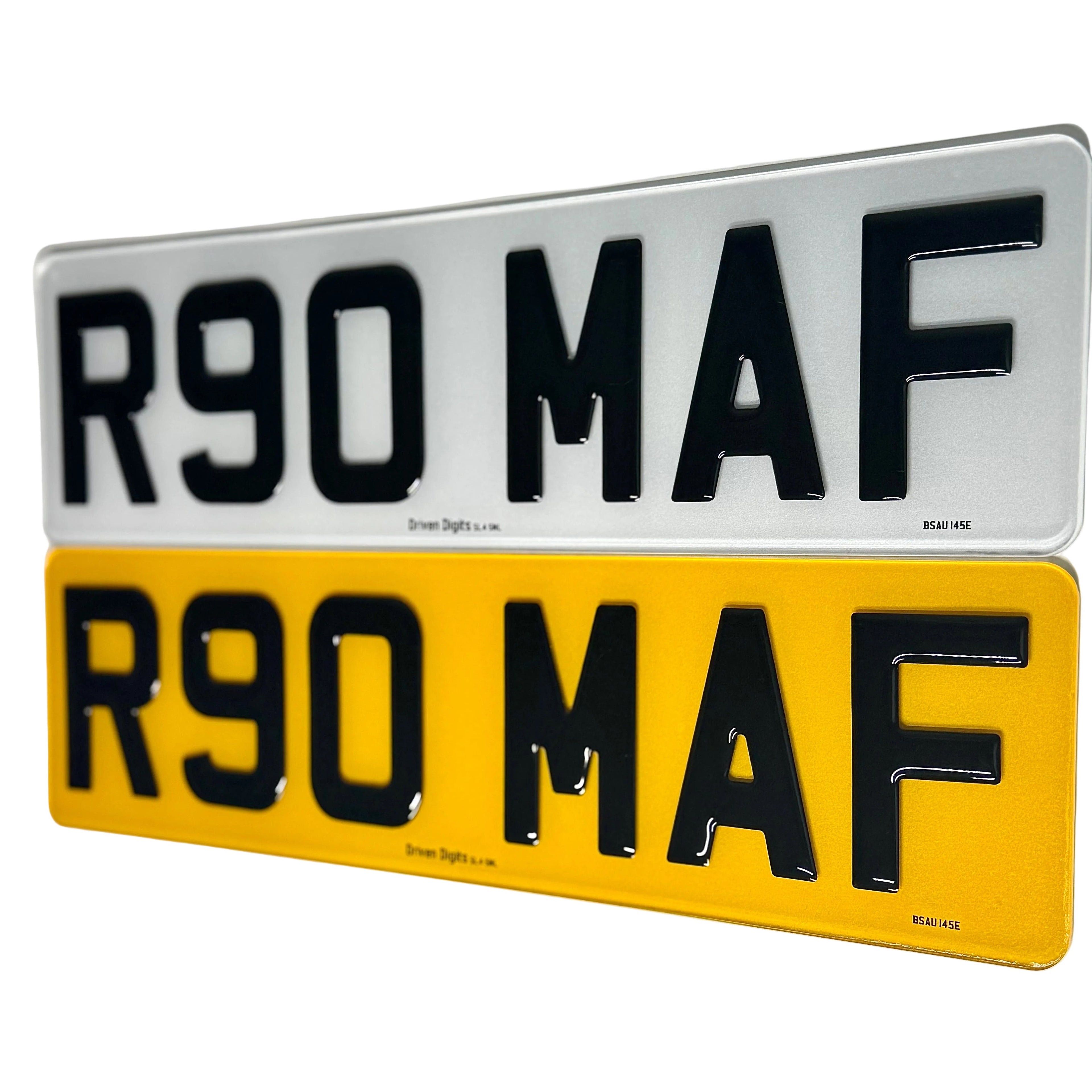 We manufacture road legal number plates in accordance with UK regulations and the British Standard BS AU 145e. This includes correct font, spacing, reflective materials, and the required supplier and standard markings.
